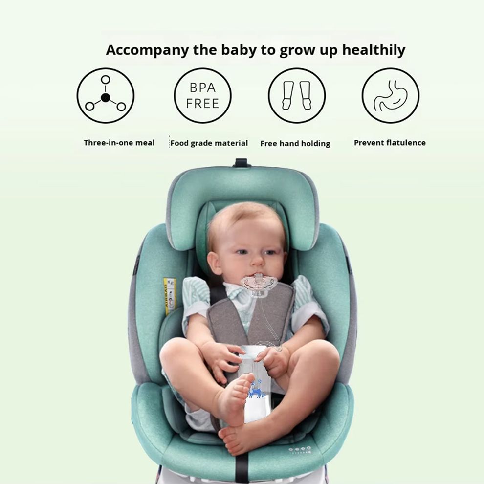 Your baby can enjoy their milk comfortably in the car seat with the connected pacifier bottle, offering safety, convenience, and hands-free feeding during the journey.