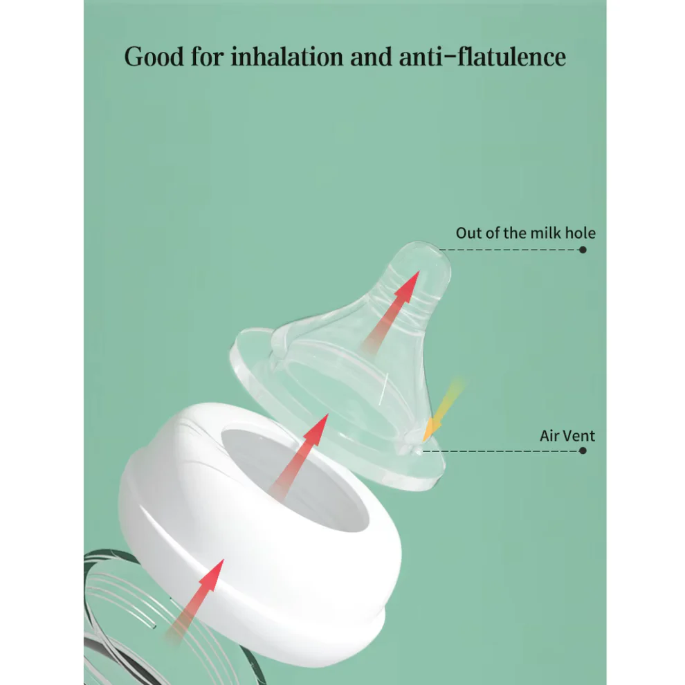 The bottle features a milk inlet and a small air outlet that allow proper airflow, helping your baby breathe comfortably while reducing gas and colic during feeding.