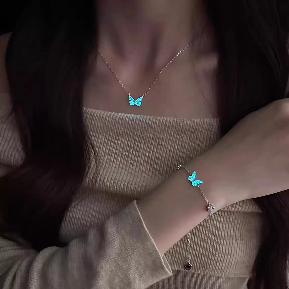 Elegant Butterfly Necklace & Bracelet Set - Glow in Style (2 Pieces)