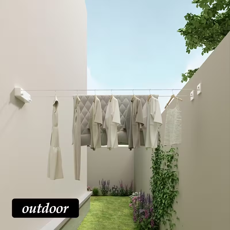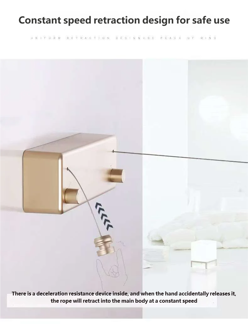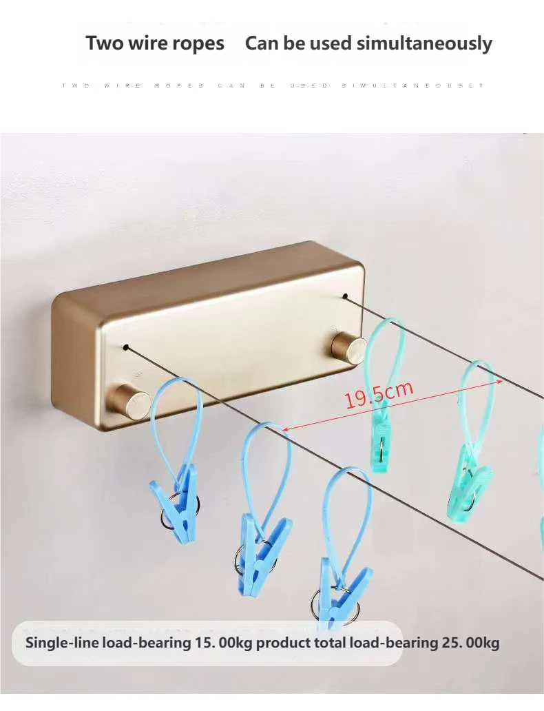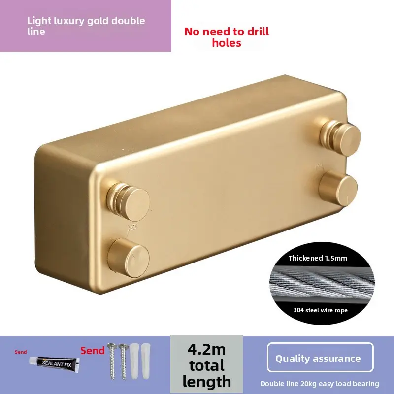 Material: ABS space aluminum/steel wireScope of application: bathroom/living room/kitchen, etcInstallation method: punch/no punchProduct Name: retractable invisible clotheslineProduct features: not easy to rust/fadeTensile length: 4.2mProduct color: golden Weight: 20 kg