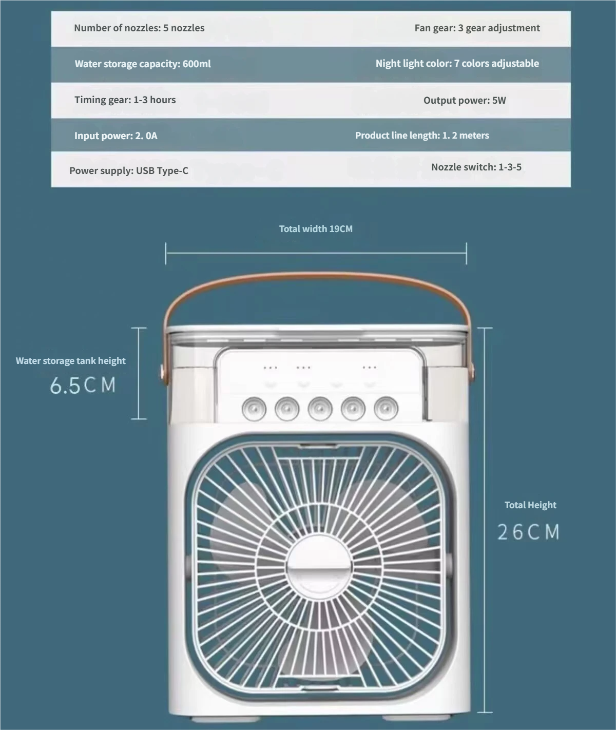 5 in 1 functional design, low-noise powerful fan, 5 large-caliber atomizers, essential oil aromatherapy tablets, 7 color lights, timer (1H / 2H / 3H) to meet all your needs