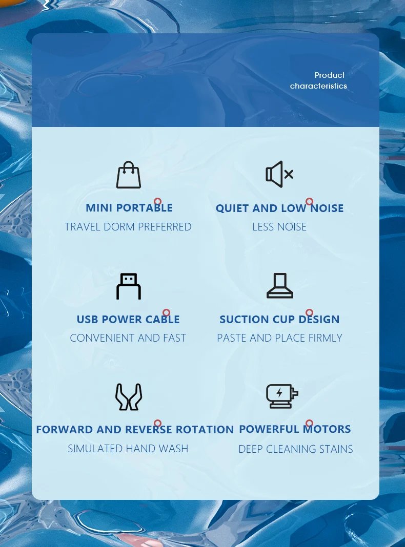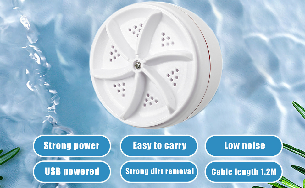 USB-powered, strong suction base, low noise, and works in any bucket or sink.
