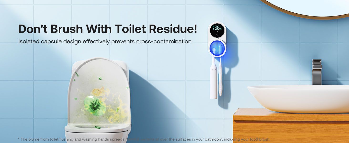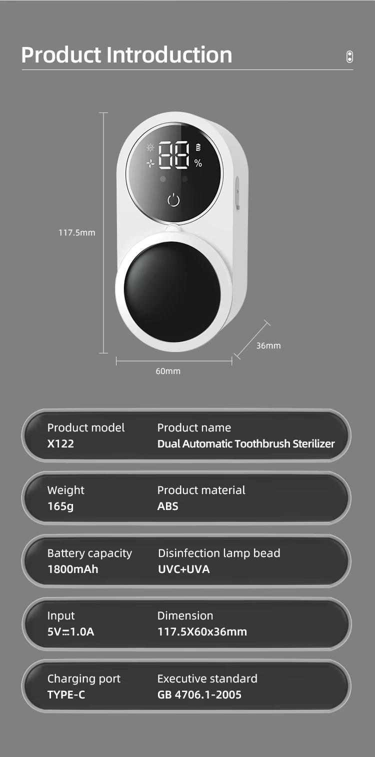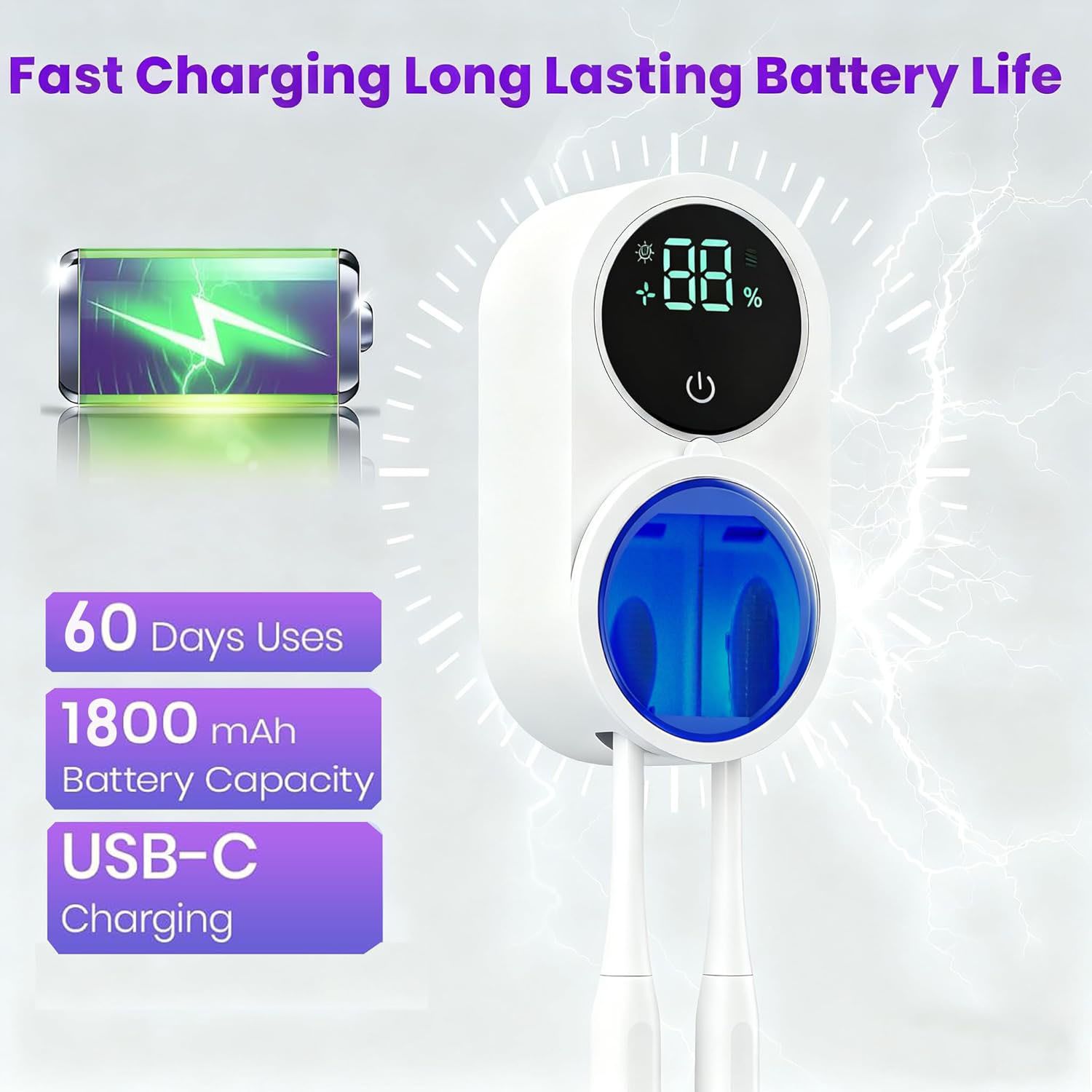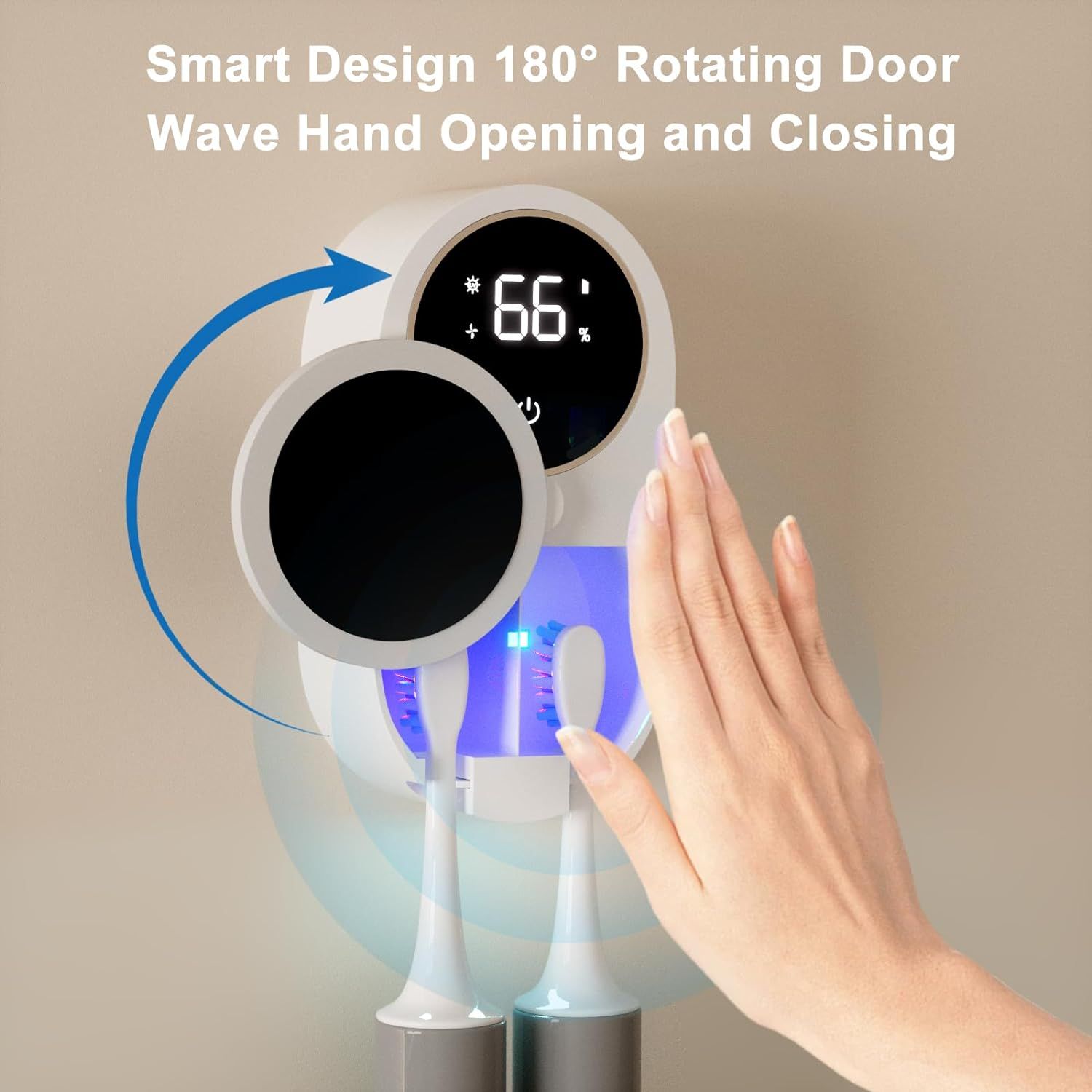 This intelligent UVC toothbrush sterilizer features motion-sensor auto open/close, powerful 360° UV disinfection, 24/7 cycle cleaning, digital display, 1800mAh long battery life & dual storage chambers to stop cross-contamination.