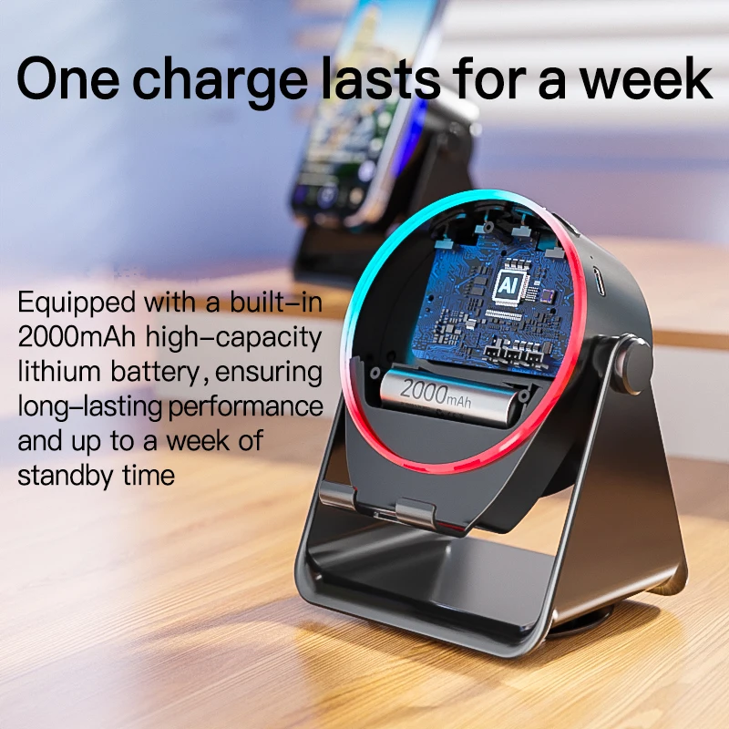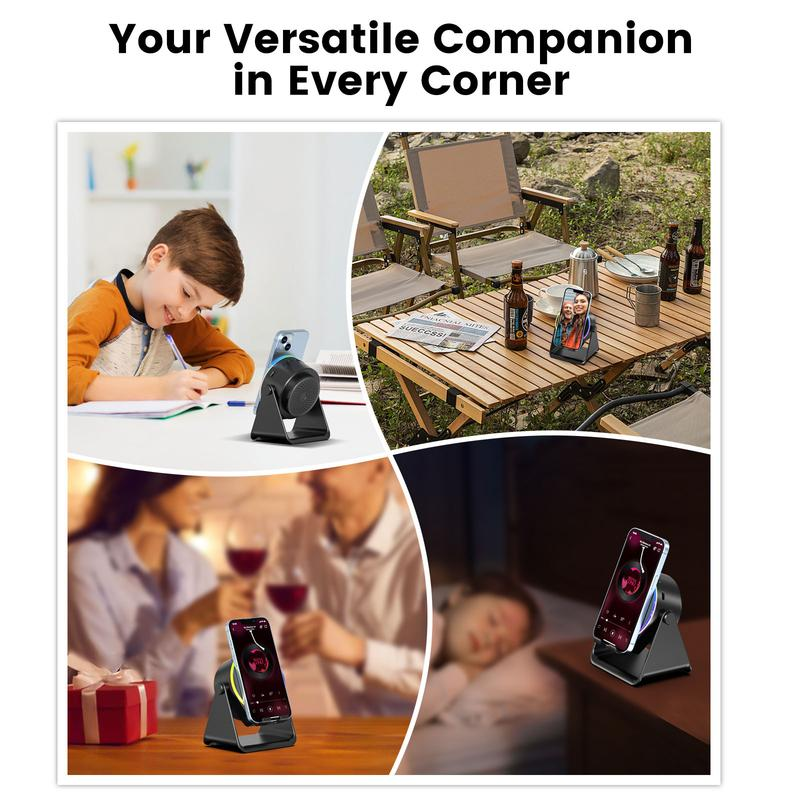 Features a unique and fun 4-in-1 design: A multifunctional device that combines wireless induction speaker,bluetooth speaker, cell Phone Stand, and ambient light that delivers high-definition stereo surround sound at any volume level for an enhanced audio experience.