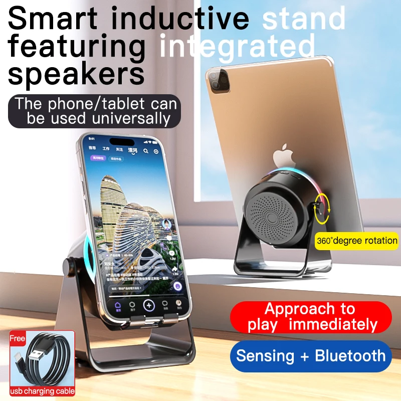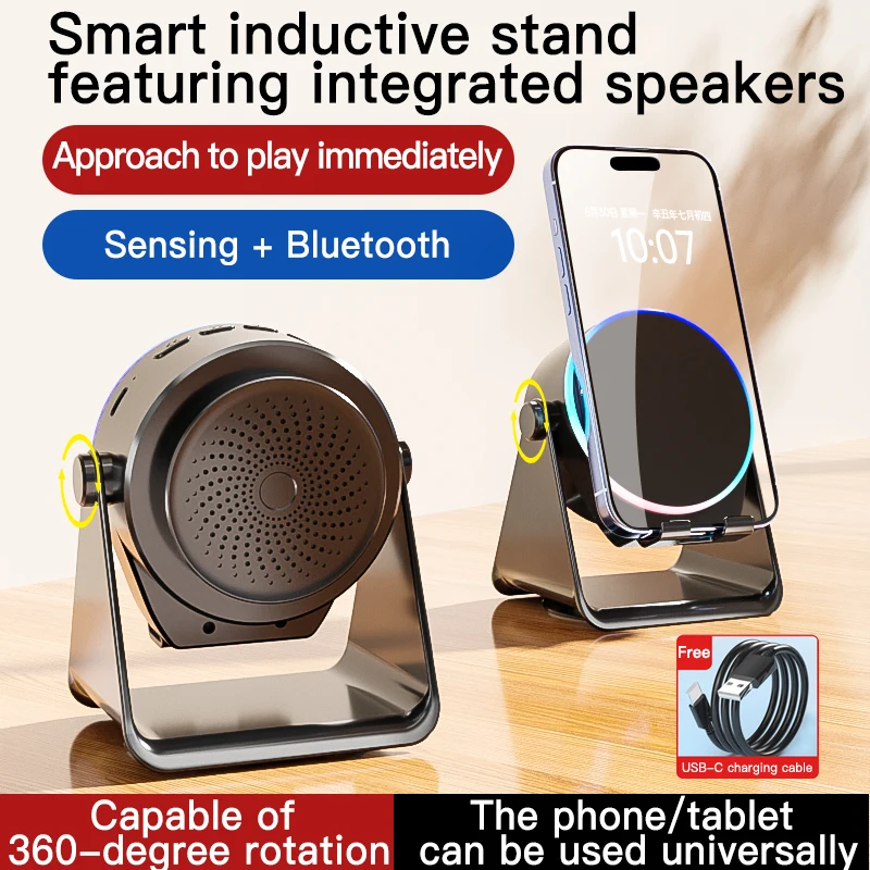 Wireless Induction Audio Bluetooth Speaker: Is a perfect breakthrough from only being able to play through Bluetooth connection. Under wireless induction mode, you can directly put your cell phone on the stand, you can play normally, can perfectly achieve enhanced bass midrange treble, clear sound, will not be distorted. It adopts the latest Bluetooth technology, with lower power consumption, faster transmission, stable signal and no delay.